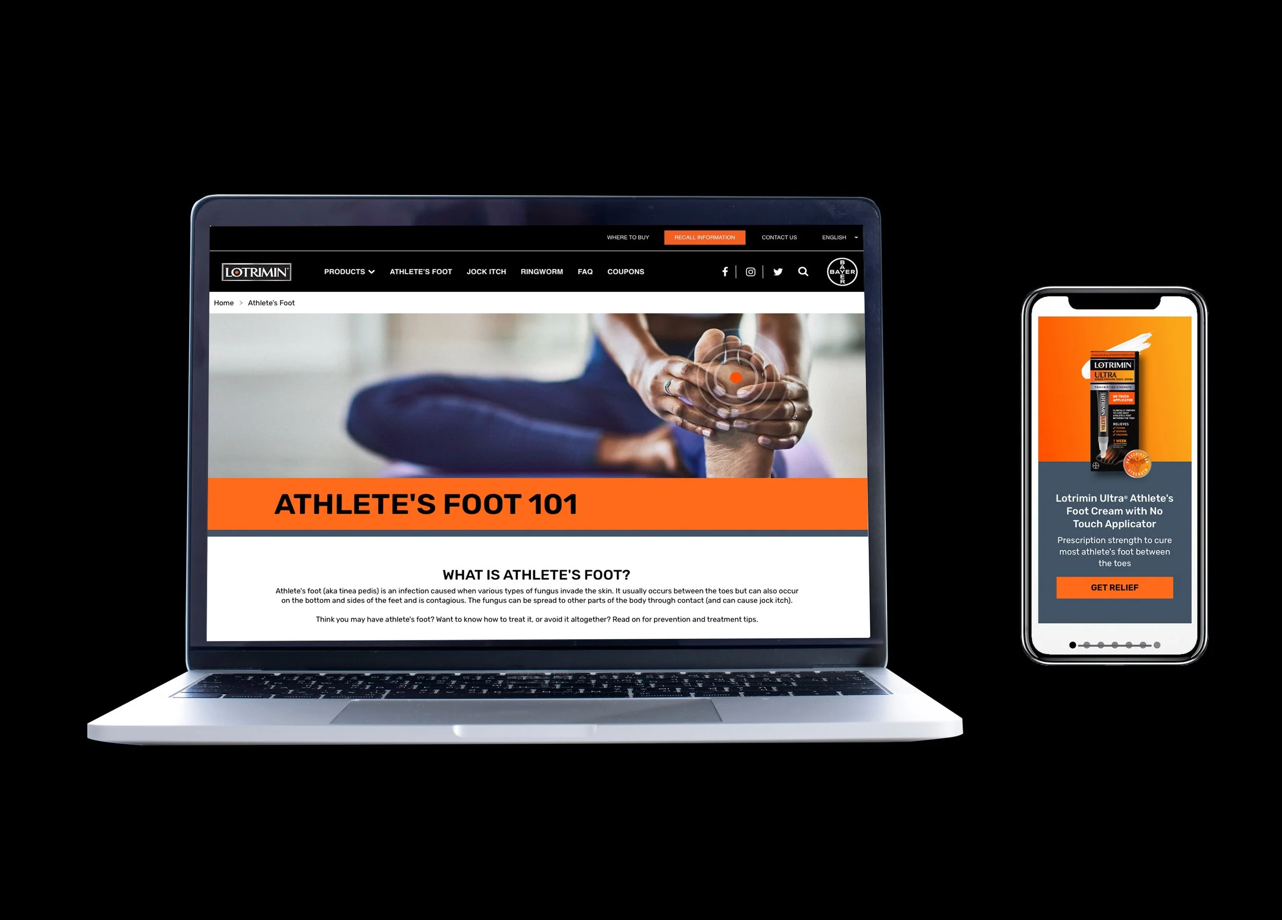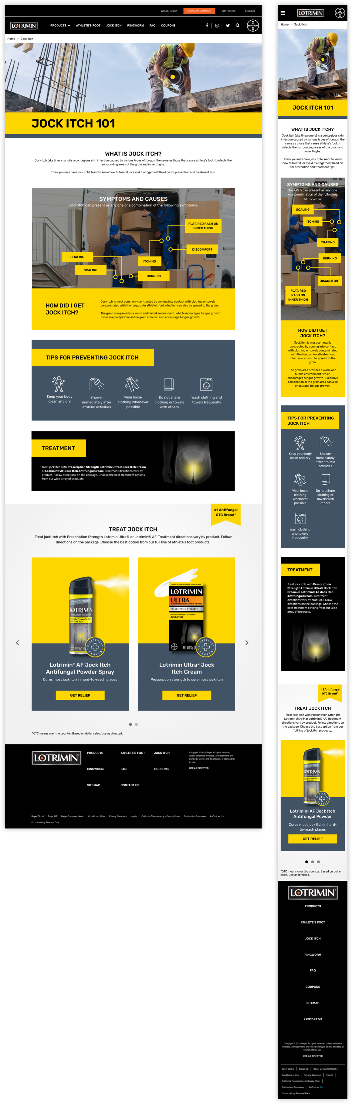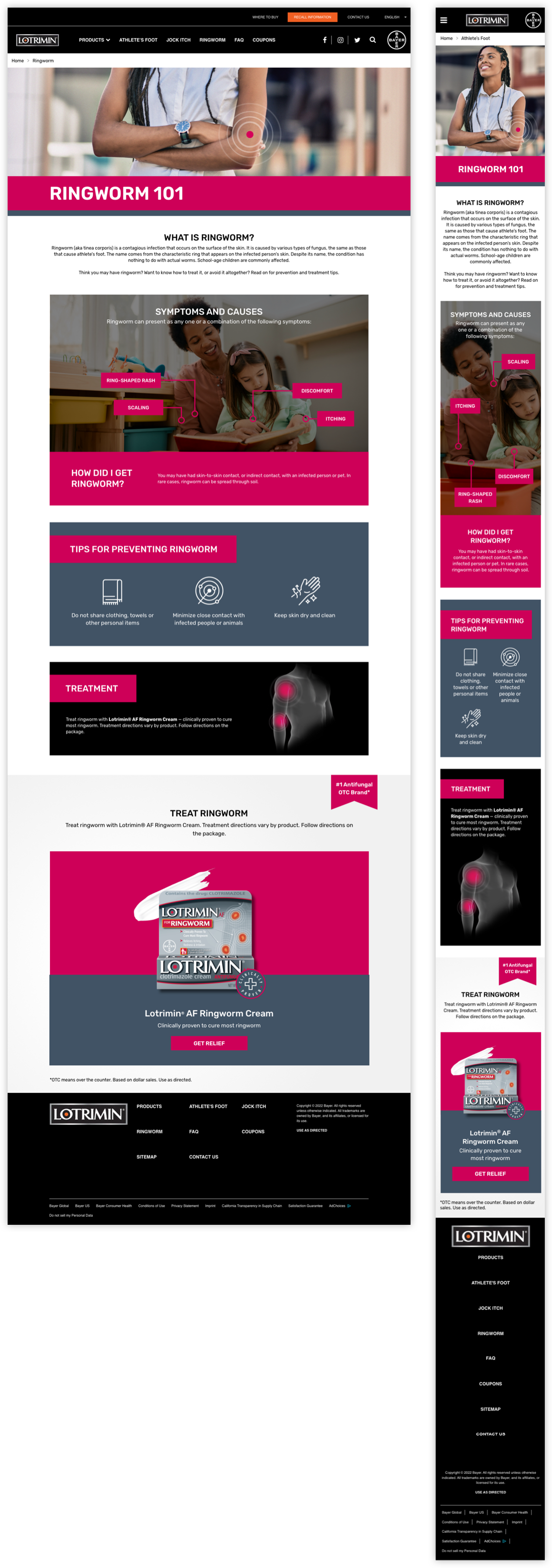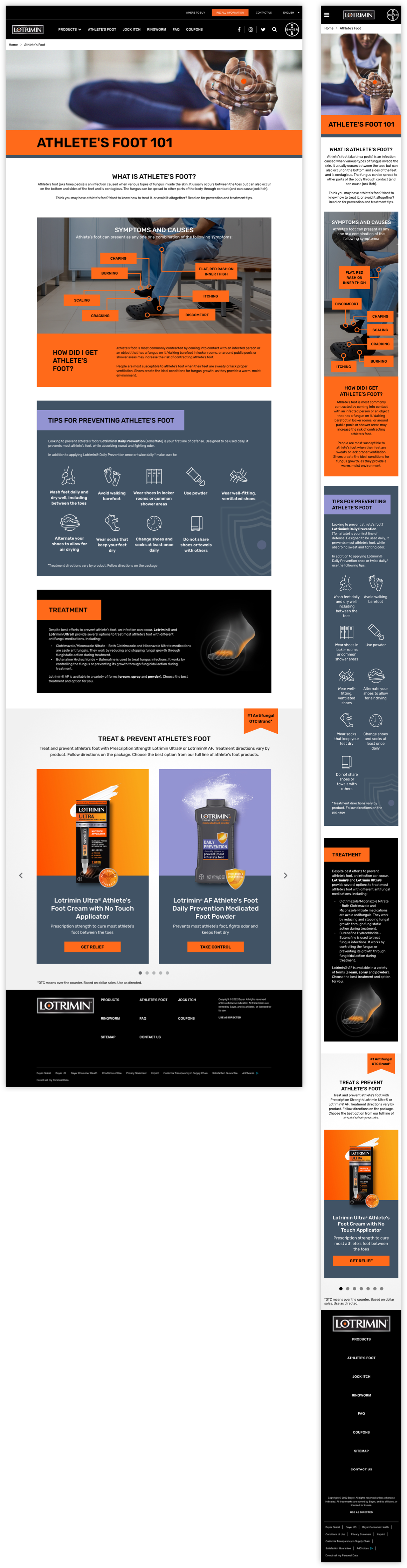 In effort to help push the brand’s new visual language, we gave the Lotrimin.com site’s athlete’s foot, jock itch, and ringworm informational pages a refreshed and optimized layout update. To help close the gap between the site’s former design and newly updated look, we took inspiration from the product packaging itself to inform our new page design.