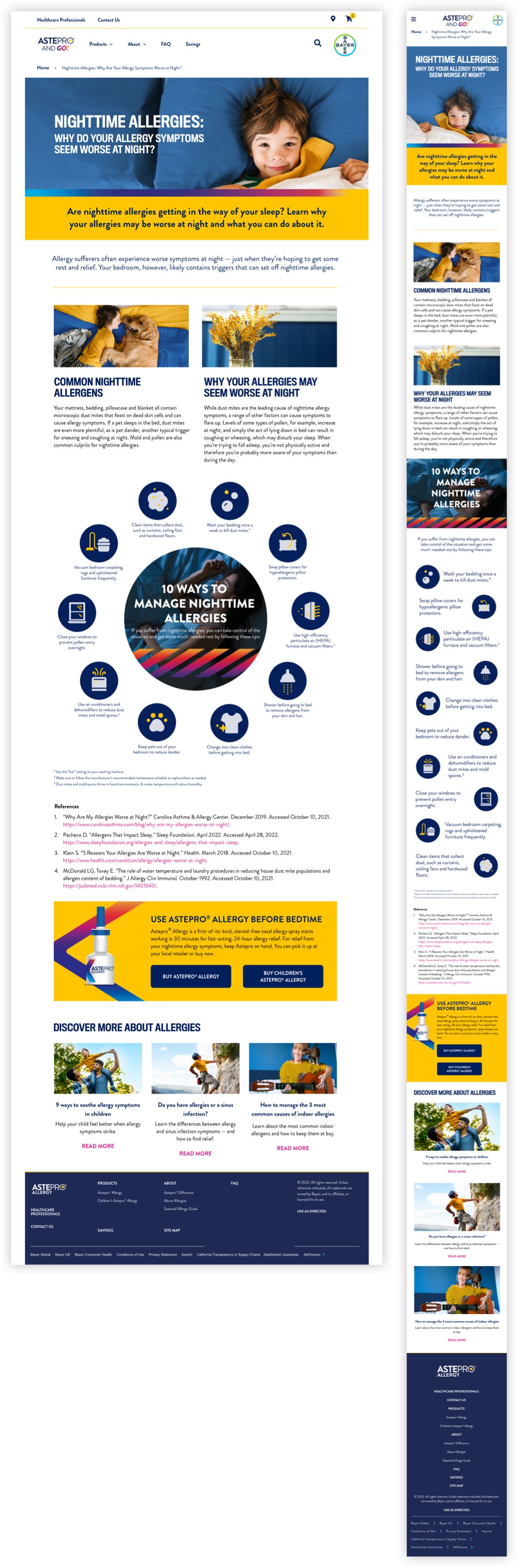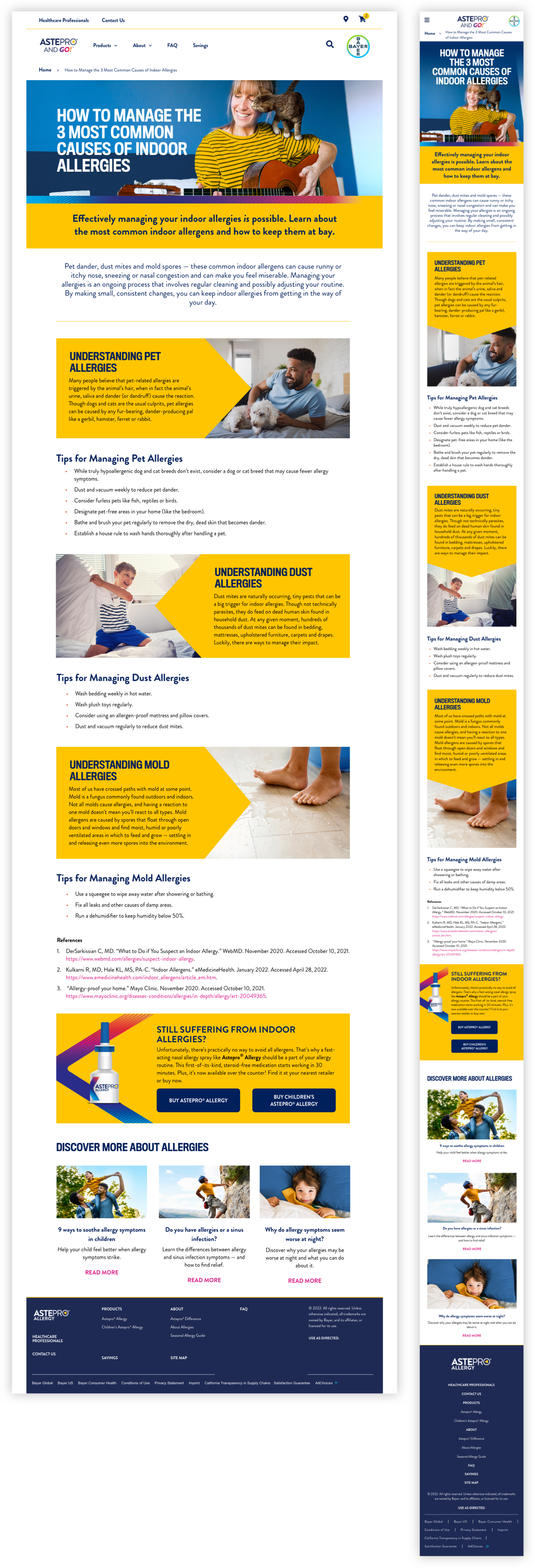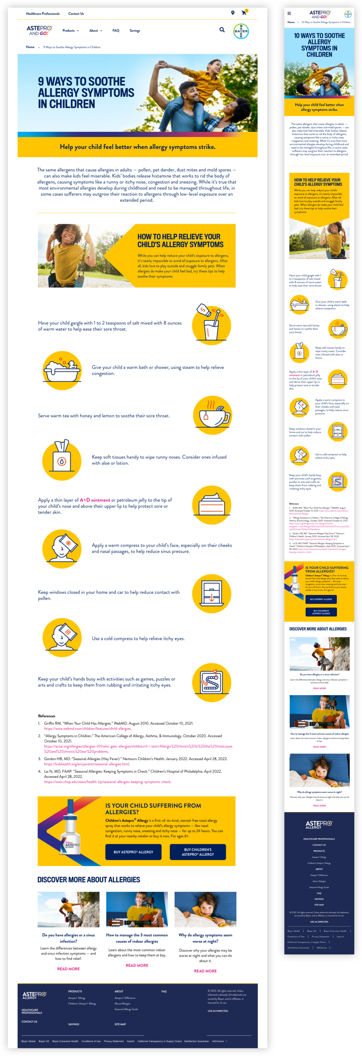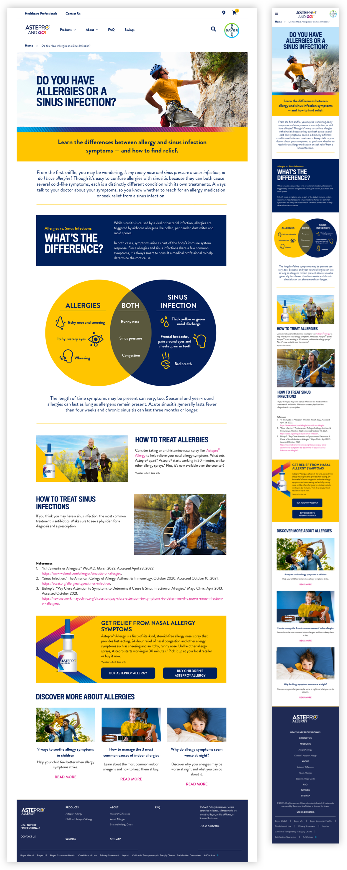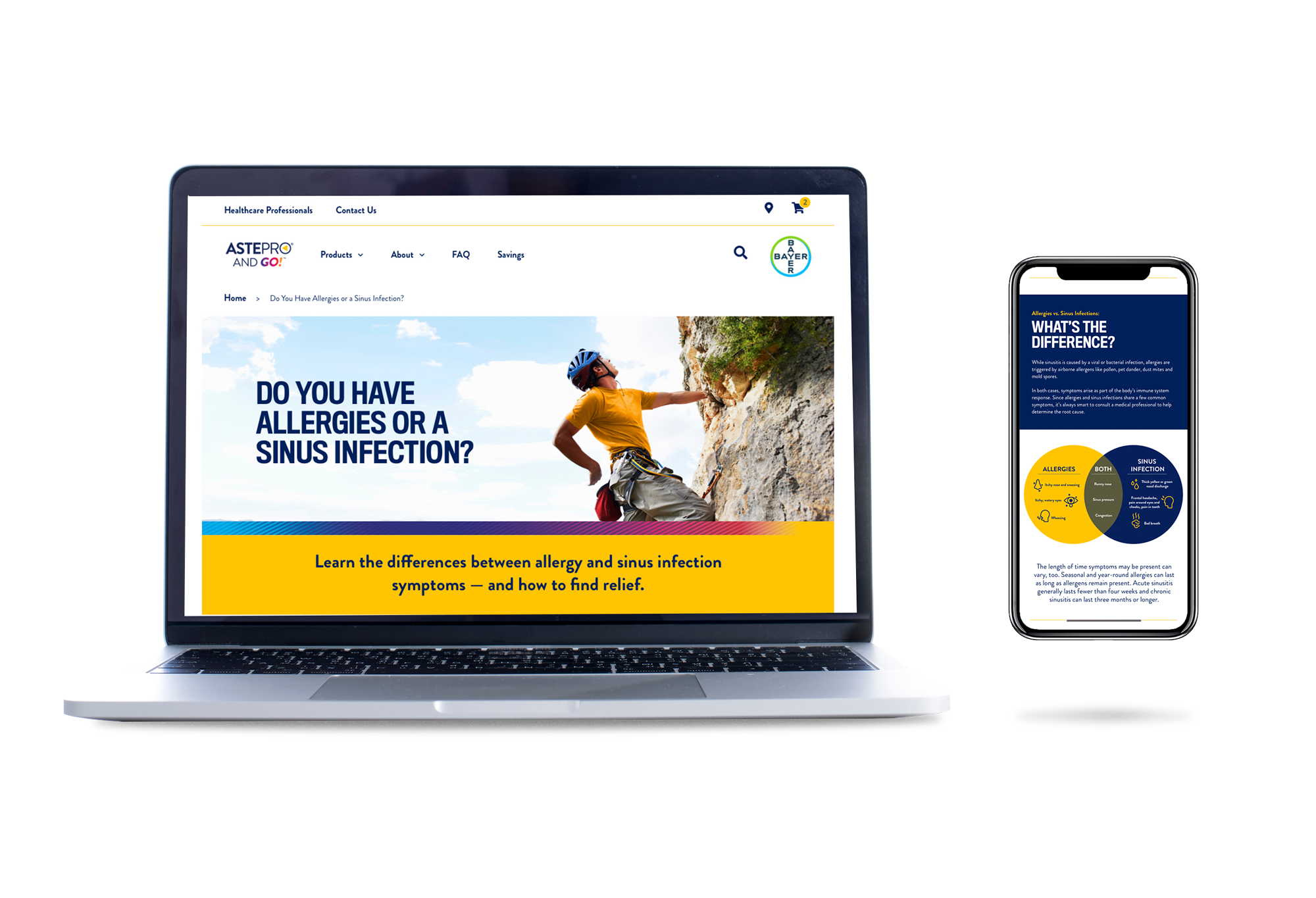 As part of the new Astepro product launch efforts, our team created the brand site design and content library. Marketed as the first steroid-free, OTC allergy spray, specifically made for the “pro” who wants fast relief from their symptoms so that they can get back to their active, fast-paced lifestyles. To help capture that same energy, we included bold coloration, active photography, and angular shapes and textures that embodied the “PRO” spirit.
